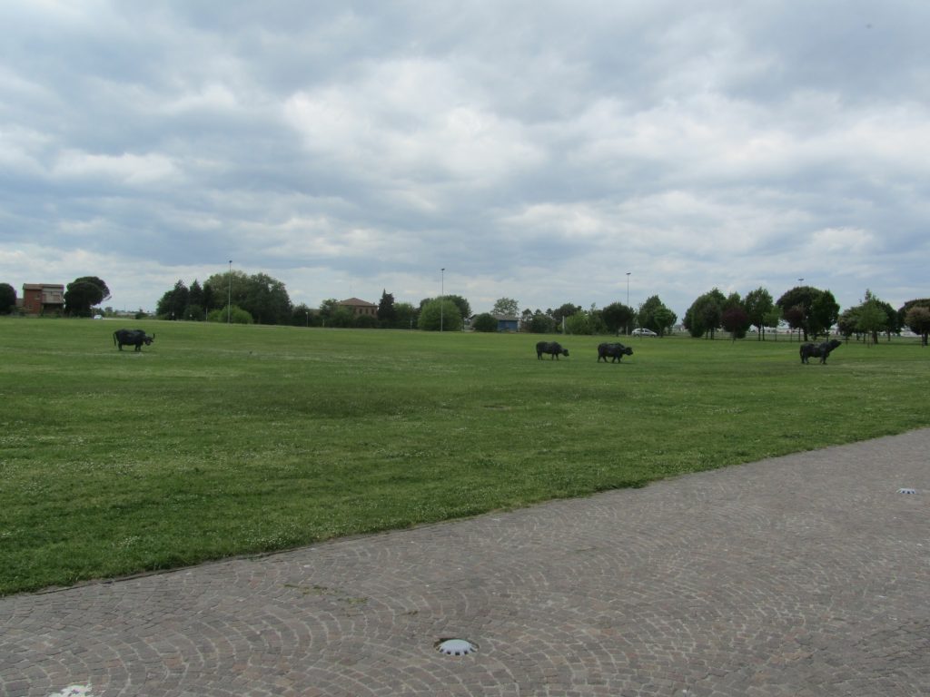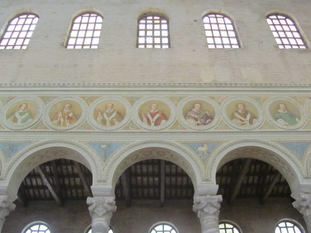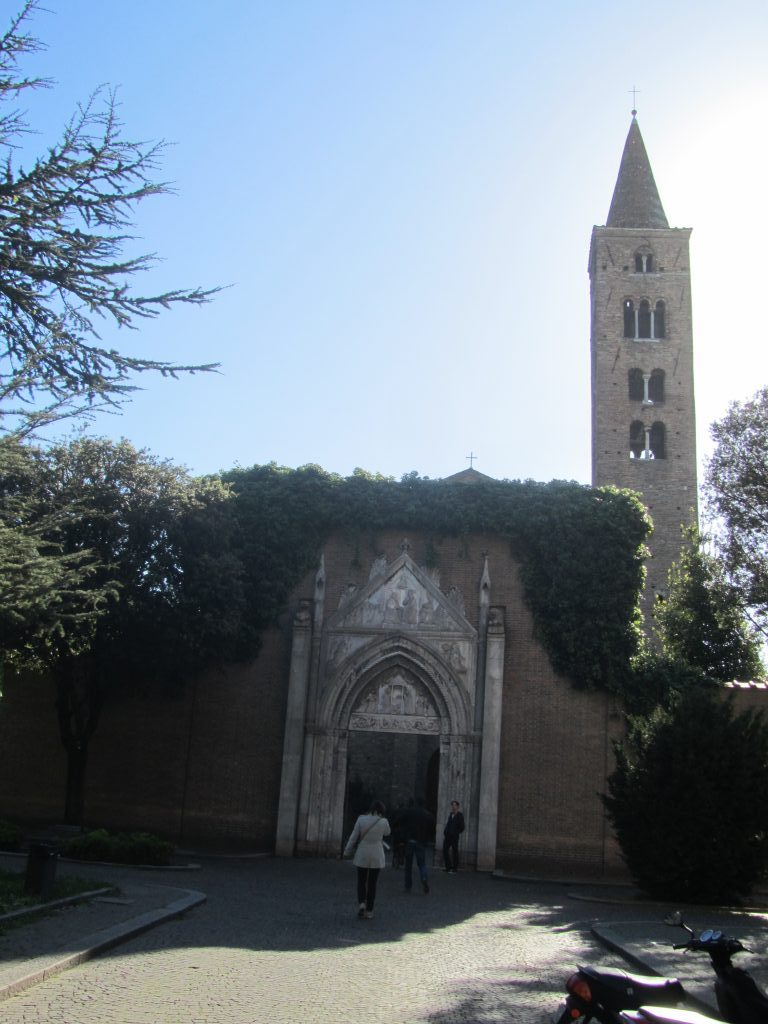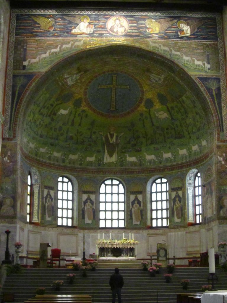 Bazilika (l. 548) stoji nekaj kilometrov izven mesta Ravena, v nekdanjem rimskem vojaškem pristanišču Classe in je na začetku delovala tudi kot predmestna utrdba. Mi smo se v njej ustavili na poti iz Riminija, saj se nam je zdelo bolj priročno, kot pa da se vanjo vračamo iz Ravene. Priznam, da smo se na začetku kar malo načudili, saj je bil prvi vtis vse prej kot prijeten. Celotna okolica je zelo glasna, iz sosednje restavracije odmeva glasba, ogromno parkirišče, po katerem se sumljivo sprehajajo moški temnejše polti pa tudi ne da pozitivnega občutka. In skoraj bi se lahko reklo, da vhod v cerkev vodi skozi hotel. Na trati pred baziliko se pasejo krave, ne, biki, ne, bivoli. Ojoj, kaj se dogaja. Človek potrebuje kar nekaj časa, da ugotovi, da so to pravzaprav bakreni kipi, ki prosto stojijo na travniku. Nepredstavljiva izkušnja, ki pa je vseeno vredna obiska. In še to: v Raveni imajo skoraj vsi spomeniki vstopnine, zato je dobro vedeti, da že v tej cerkvi kupite karto, ki vsebuje več znamenitosti. Priporočam, saj pride mnogo ceneje, kot pa da bi kupovali vsako posebej.
