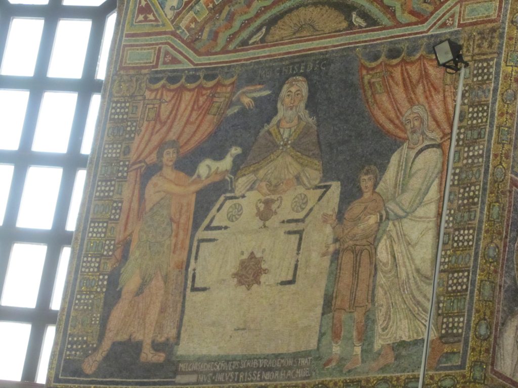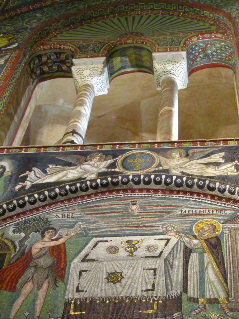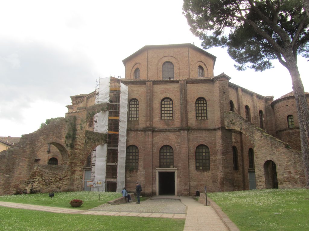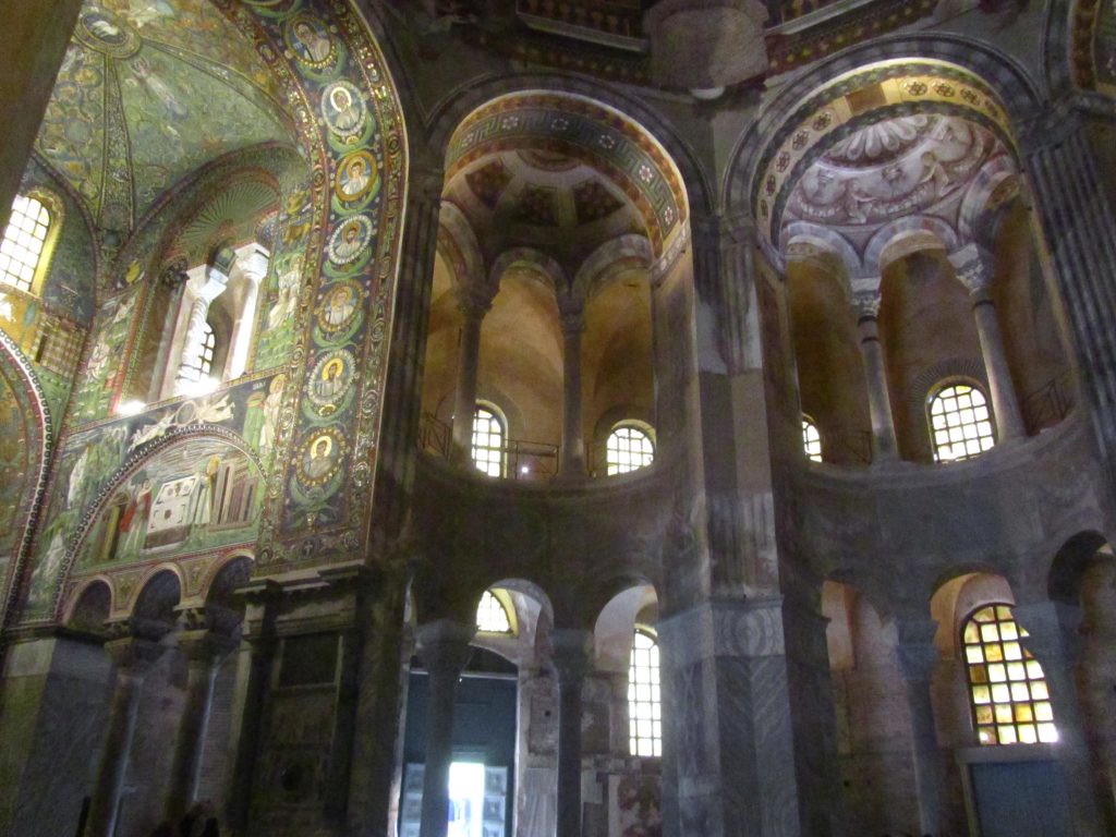 Bazilika je od nekdaj vzbujala občudovanje in je bila celo najlepša italijanska cerkev v 9. stoletju. Zgrajena je bila sredi 6. stoletja in je podala celo vrsto idej za celotno romansko, otonsko in karolinško arhitekturo. Zgradba je pravzaprav tri-nadstropni oktagon, ki je povezan s cesarsko palačo in mavzolejem Galle Placidie. Čeprav je najbolj znana po bizantinskih mozaikih, ne stecite takoj tja, ampak si poglejte tudi baročne freske v kupoli. V apsidi pa nas pričakajo eni najbolj poznanih mozaikov na svetu, ki niso narejeni iz marmorja, kot so bili pred tem časom, pač pa iz majhnih steklenih kamenčkov. Na sredini na zemeljski obli sedi Kristus kot mlad vladar, poleg njega pa stojita dva angela ter Sv. Viktor in škof Eklezij z modelom cerkve v roki (ustanovnika). Na oboku nad oltarnim delom je medaljon z mističnim jagnjetom in štirimi angeli. Na levi strani lahko vidimo Abrahama, ki sprejema tri identične angele in radovedno Saro, ki jim prisluškuje. Desno od njih je daritev Izaka. Poleg je grandiozen mozaik Justinijana s spremstvom, ki naj bi bil zelo portretno verodostojen. Oblečen je v purpurna oblačila, kar je simbol veličastja. Zraven stojita dva tajnika ter nadškof Maksimian z oboroženci. 12 oseb + cesar Justinijan naj bi predstavljali 12 apostolov + Jezusa. Pod mozaikom stoji tudi klop za klerike, kar ponazarja, da je njegova daritev v soglasju z duhovščino. Nasproti se bohoti mozaik Teodore, ki prihaja k maši. Vidimo, da nastopa v vlogi cesarice, saj ima prav tako oblečen purpurni plašč in diadem z bizantinsko krono. Studenec z vodo pod zastorom, ki ga odgrinjata dva pribočnika, simbolizira Marijino čistost. S tema mozaikoma sta Justinijan in Teodora upodobila dvoje: cesarstvo in duhovno kraljestvo (ikonografski preplet sakralnih in profanih elementov). Desno od Teodore pa je še mozaik, ki ponazarja daritev Abla in Melkizedeka, katerega molitev je bila v tem času del liturgije (govorjena in naslikana beseda sta bili obvezni). Ostali mozaiki se povezujejo z že opisanimi motivi daritev in Božje besede. Ne skrbite, če se vam vse skupaj zdi preveč zakomplicirano; skoraj vedno se po cerkvi potikajo skupine turistov z vodičem, ki govori angleško in brez problema se jim lahko pridružite za kratko vodstvo.