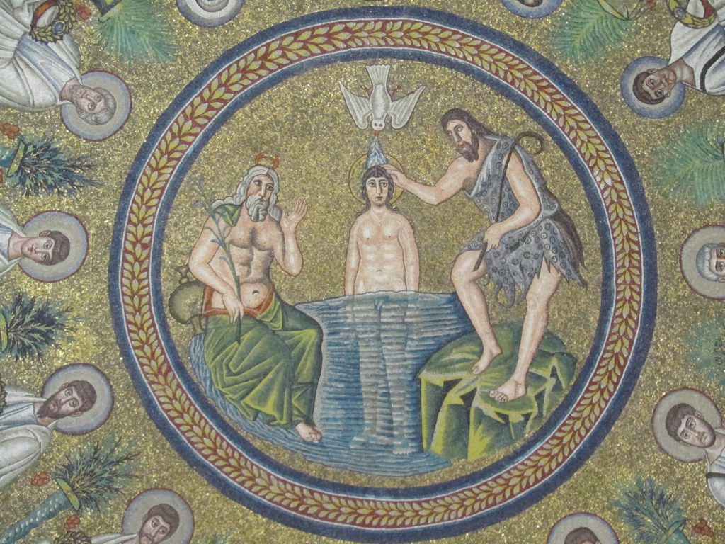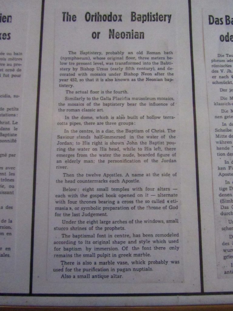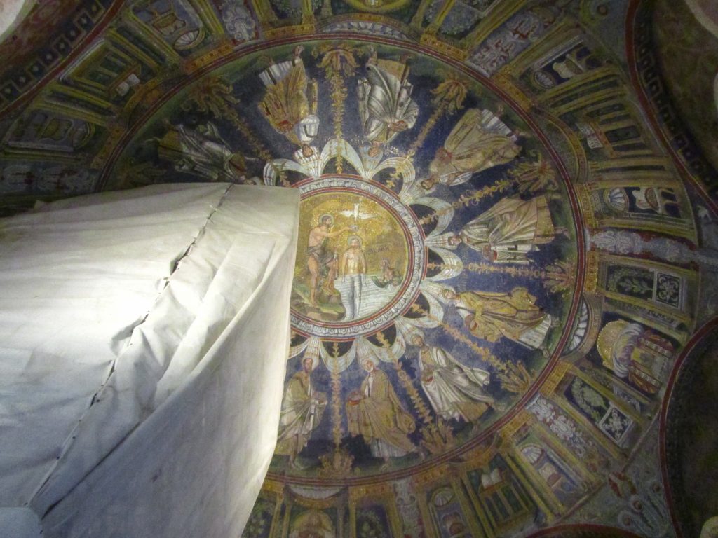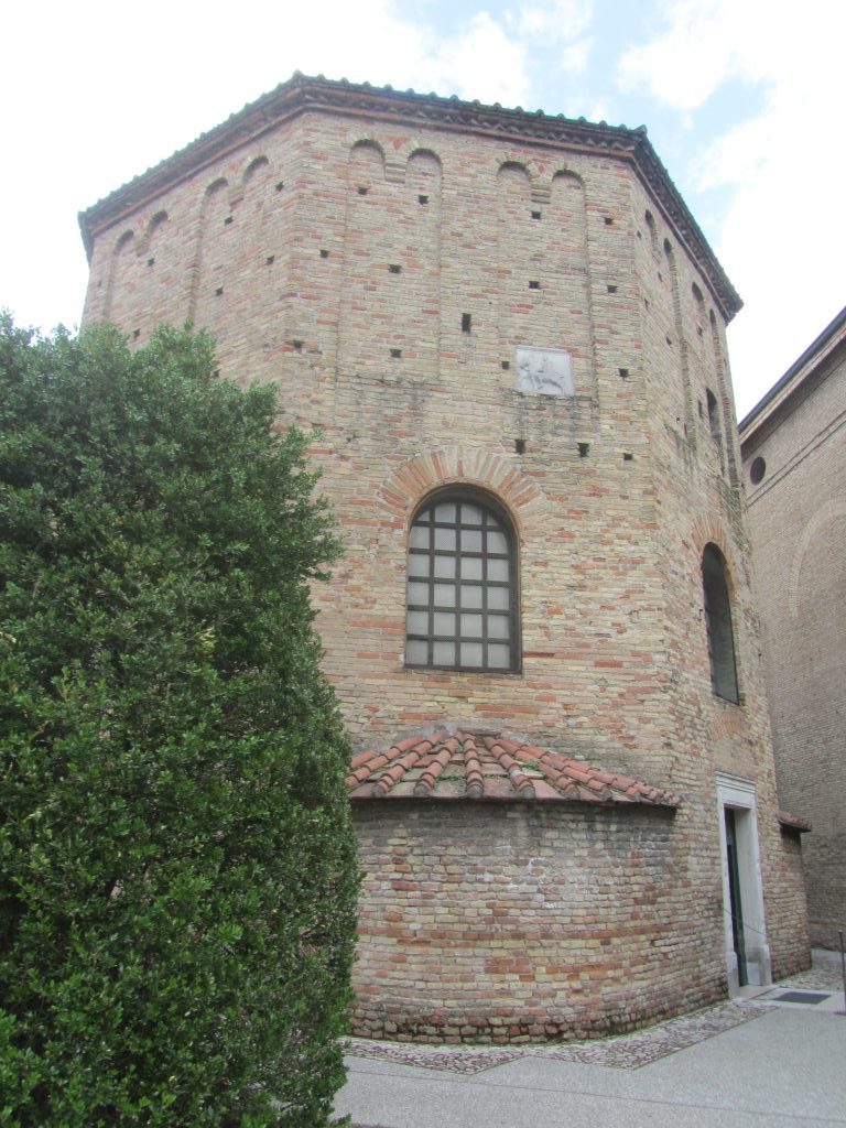 Najprej smo se iz oči v oči srečali z manjšo oktagonalno opečnato zgradbo, katere pod je nižji od današnje ceste, zato izgleda, kot da se dviguje iz tal. To arijansko krstilnico je dal zgraditi Teodorik v 6. stoletju, da je vernike ločil od ortodoksnih kristjanov. Dovolil jim je skupno bivanje v mestu, kljub temu, da je bilo arijanstvo oblika krščanstva, ki so jo preganjali, ker uči, da je Kristus manj vreden od Boga. Danes je od mozaikov ohranjen le tisti v kupoli. Centralna scena krsta se ne razlikuje dosti od tiste v Neonijanskem/Ortodoksnem/Pravovernem baptisteriju; glavna razlika je, da je tu Kristus upodobljen kot mlad fant brez brade. Poleg njega stojita moški, ki je personifikacija reke Jordan (na glavi ima rakove klešče, poleg sebe pa vazo, ki je simbol za reko) in Janez Krstnik. V koncentričnem krogu stojijo ne tako živi apostoli, prostor pa delijo palme.