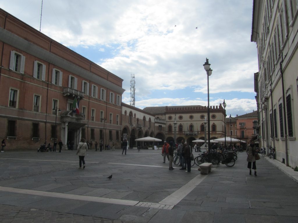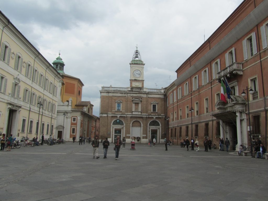 Kamorkoli se odpraviš v centru mesta Ravena, skoraj vedno se boš znašel na glavnem Trgu Popolo, ki so ga zgradili takrat poveljujoči Benečani v 15. stoletju. Trg je vedno poln, saj se čez njega zgrinjajo množice turistov in lokalcev, ki hitijo v službe. Ne manjka pa se tudi pravih italijanskih kavarnic, kjer si lahko odpočiješ noge. Na koncu trga z beneškim pridihom sta postavljena dva stebra, na katerem stojita patrona mesta Sv. Apolinarij in Sv. Vitalij. Z njega vodijo lepo tlakovane ulice v vse smeri, potrebno je le paziti na čete kolesarjev in pri prečkanju pogledati v obe smeri, kljub znakom za enosmerno cesto.