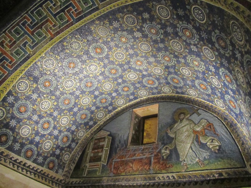 Ogled te kapele in muzeja ni bil na našem uradnem seznamu znamenitosti, vendar je le nekaj korakov stran od krstilnice, zato smo si rekli »zakaj pa ne« in si pogledali tudi to. Najprej smo se sprehodili po cerkvi, v kateri so katakombe sodobnih monsignorjev, nato pa smo vstopili v muzej. Žal je notri prepovedano fotografiranje, tako da ne morem pokazati čudovitega slonokoščenega prestola nadškofa Maksimiana, z nepredstavljivimi izrezljanimi detajli. Res je vreden ogleda, prav tako kot majhna kapela, ki se nahaja sredi muzeja. Kapela Sv. Andreja je edina kapela iz zgodnjekrščanske dobe (konec 5. stoletja), ki je popolnoma nedotaknjena. Obložena je z marmorjem, zgoraj pa je mozaik, ki je zelo podoben tistemu na stropu Galle Placidie. Ostali mozaiki so posvečeni Jezusu Kristusu in uveljavljajo principe ortodoksnih katolikov. Zanimivo pa je to, da so v medaljonih upodobljene tudi svetnice in ne le svetniki. Če imate čas, priporočam ogled tega spomenika, v katerem se vam ne bo potrebno prerivati, da bi videli čudovito izdelane mozaike.