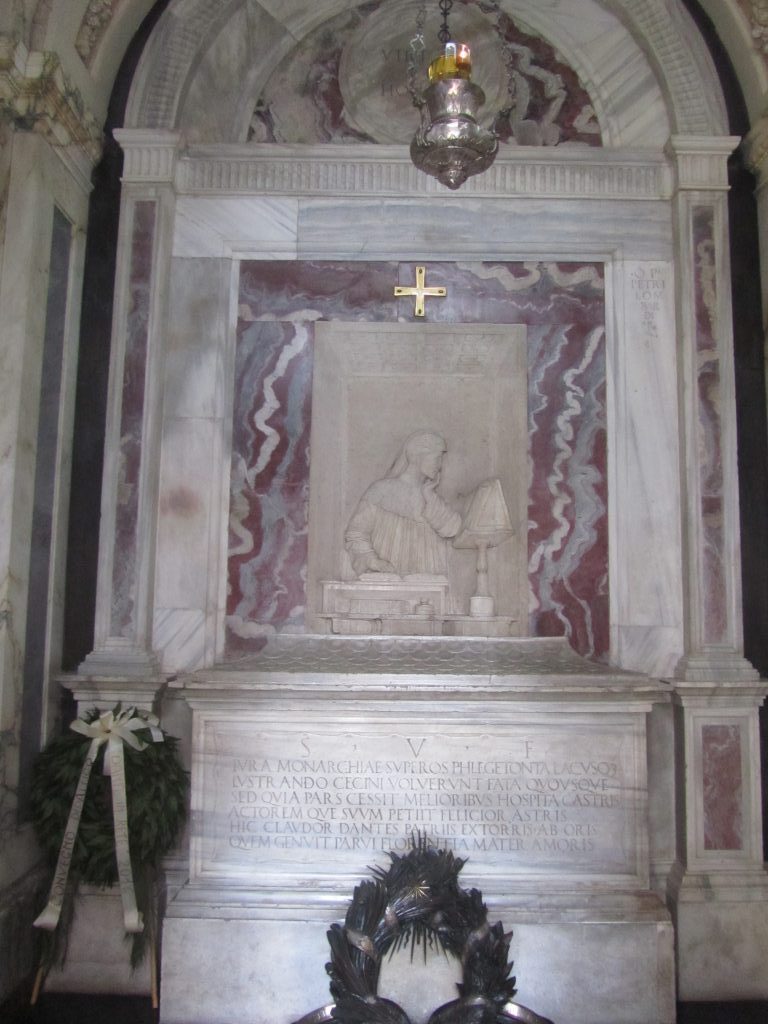 Kratek sprehod po ulicah in že smo pri grobnici Danteja Alighierija. No, tam smo bili že pred obiskom Neonijanskega baptisterija, vendar je bila taka gneča, da smo se samo obrnili. Stisnjena na koncu uličice potrebuje prostor, da zadiha, zato je pomembno, da ste tam sami. Dante Alighieri (1265 – 1321), eden največjih italijanskih pesnikov, je bil zaradi političnih simpatij pregnan iz Firenc in se je ustalil v mestu Ravena. Prav tu je začel s pisanjem svoje Božanske komedije. Grobnica ne izgleda prav nič srednjeveška, saj je bila dejansko zgrajena šele v 18. stoletju. Notri je dopasni portret pesnika in žara z latinskim epitafom. Na vrtu cerkve Sv. Frančiška, kjer se je odvijal Dantejev pogreb, stoji gomila, pokrita z zelenjem. Prav na tem mestu so v času 2. svetovne vojne skrivali pesnikove kosti, da jih slučajno kdo ne bi odnesel. Ogledali smo si tudi preprosto cerkev in imeli res srečo, saj so ravno v tistem času igrali na orgle.