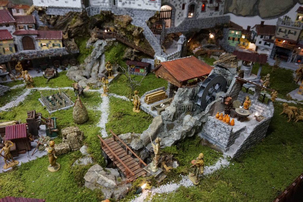 V ozadju jaslic stoji tudi mogočen grad, pot do njega pa zapira kar nekaj vrat, ki se seveda odpirajo in zapirajo, dvižni most, ki se dviga in spušča… v sredi jaslic kraljuje cerkev, v kateri pozvanja zvonček… v jaslicah Jožef ziblje Jezusa… iz ene od hišk se vsake toliko časa prikaže kužek in na balkonu ene od hišk celo veter ziblje in suši perilo…