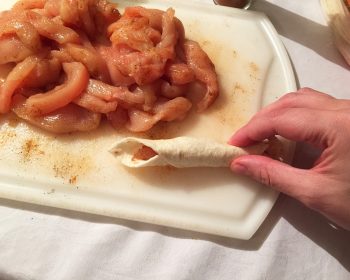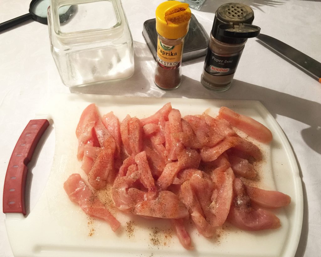 Piščančje prsi narežemo na približno 0,5 cm široke trakce. Dodamo papriko v prahu, poper, sol in vse skupaj dobro zmešamo. Mi mesa predhodno nič ne pečemo, saj se kasneje zelo lepo prepeče.