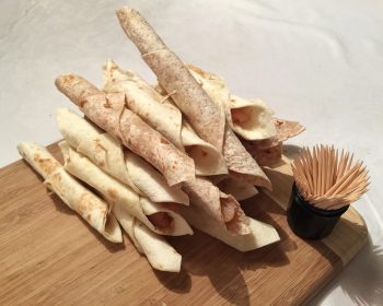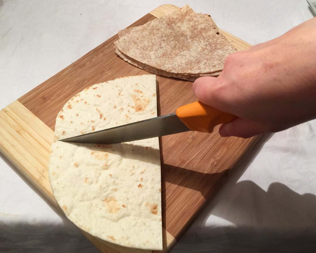 - Tortilje razrežemo na 4 dele, tako da dobimo manjše trikotnike.