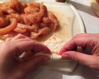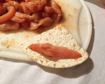 Pazite, da v tortiljo ne zavijete preveč debelega kosa mesa (nočemo da je po cvrtju še kaj surovo)!